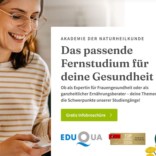 Ganzheitliche Gesundheitsausbildung: Die Akademie der Naturheilkunde bietet Fernstudiengänge und Online-Kurse rund um Gesundheit, Ernährung und ganzheitliche Prävention an.